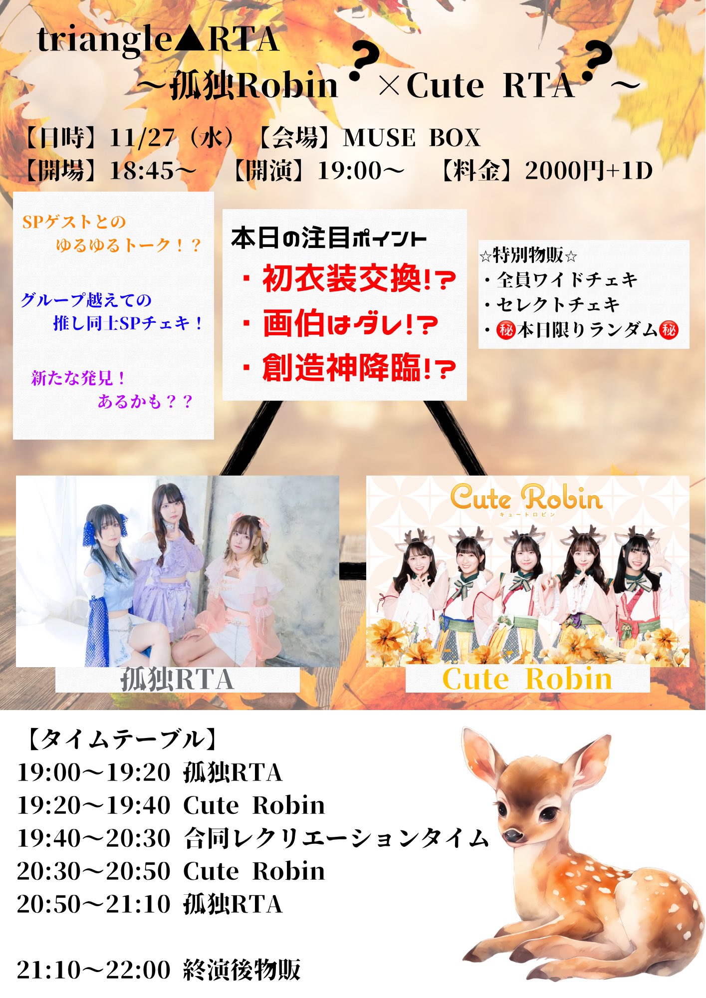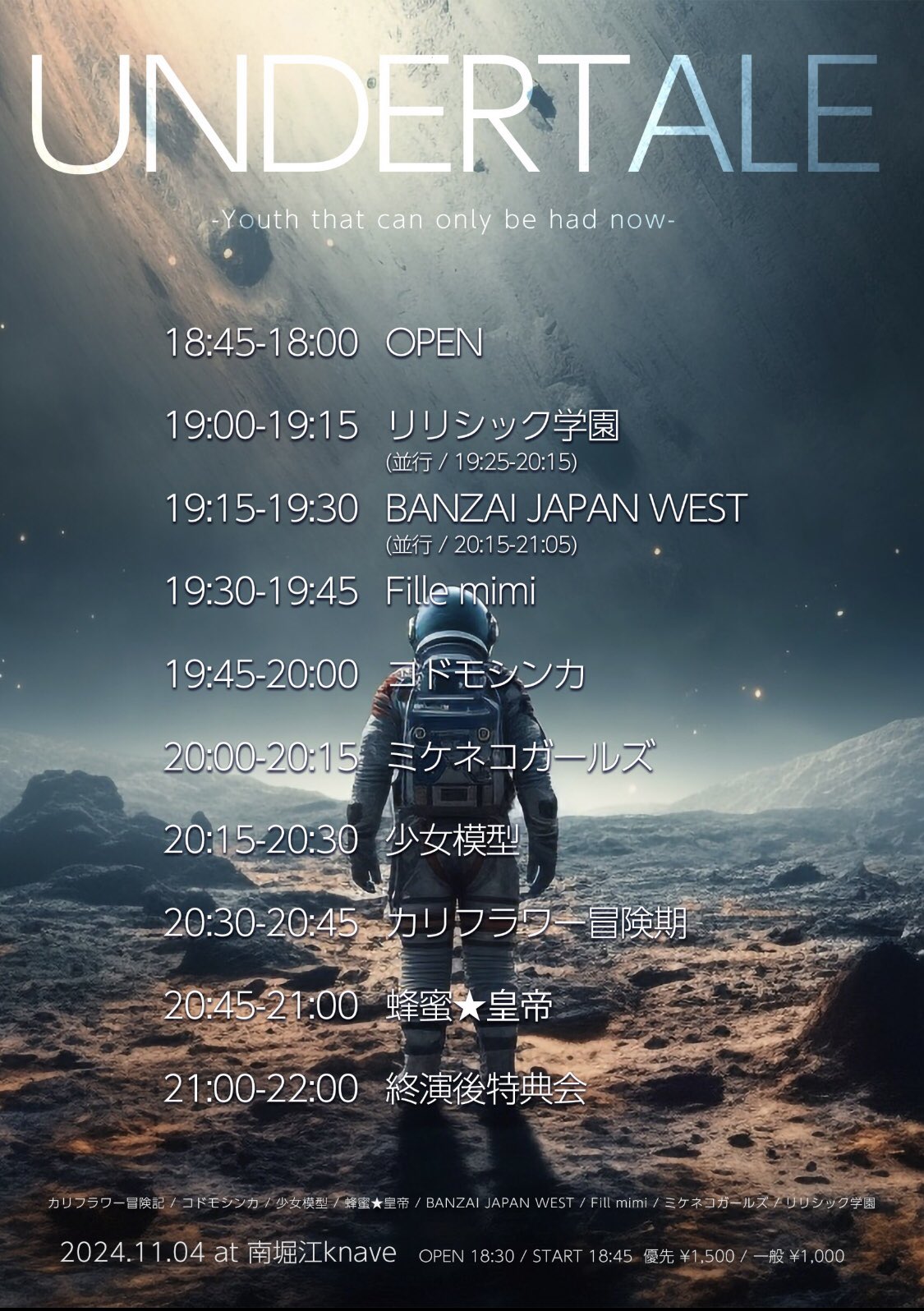 最新イベント情報 2024/11/27(水) triangle△RTA〜孤独Robin?×Cute RTA?〜@MUSE BOX 2024年11月5日 2024/11/9(土)「紅鶴の終わりと私たち」@ライブシアターなんば紅鶴 2024年11月4日 2024/12/3(火)MusiCleaN Vol.5@アメリカ村DROP 2024年11月4日 2025/4/7(月)「EURO’N NIGHT 定期公演」@心斎橋BIGCAT 2024年11月3日 2024/11/11(月)「IDOLOOKIN ポッキーの日スペシャル」@ポルックスシアター 2024年11月2日 2024/11/4(月祝)UNDERTALE@南堀江knave 2024年11月1日 前ページ 次ページ 登録 下にメールアドレスを入力いただくと、最新情報をお届けします。 メールアドレスを入力… 購読
