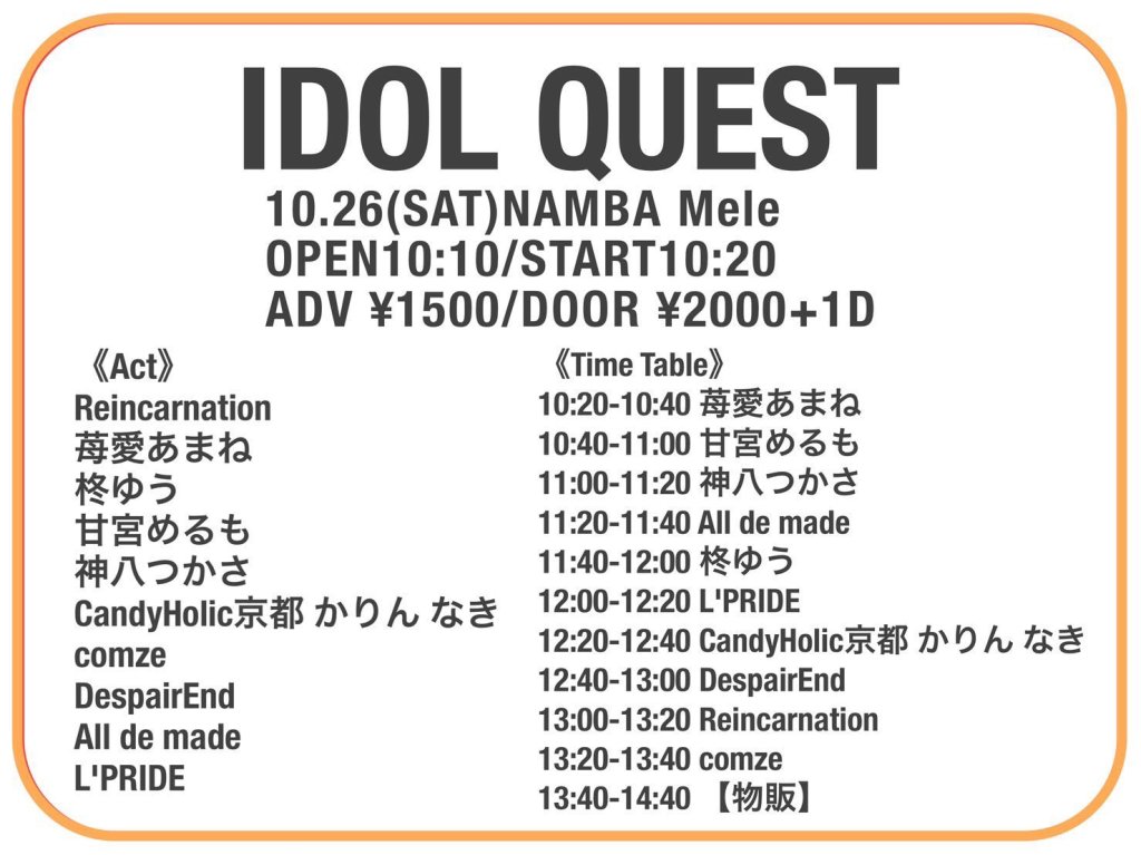 2024/10/26(土)「IDOL QUEST」 @難波Mele 2024/10/26(土) 「IDOL QUEST」 会場:難波Mele(アクセス) OPEN 10:10/START 10:20 前売 ¥1,500/当日 ¥2,000(別途1ドリンク代必要) 出演:Reincarnation、苺愛あまね、柊ゆう、甘宮めるも、神八つかさ、CandyHolic京都 かりん なき、comze、DespairEnd、All de made、L’PRIDE(順不同) 予約:https://tiget.net/events/353694 共有: X で共有 (新しいウィンドウで開きます) X Facebook で共有 (新しいウィンドウで開きます) Facebook いいね 読み込み中… 関連 コメントを残す コメントをキャンセル Δ