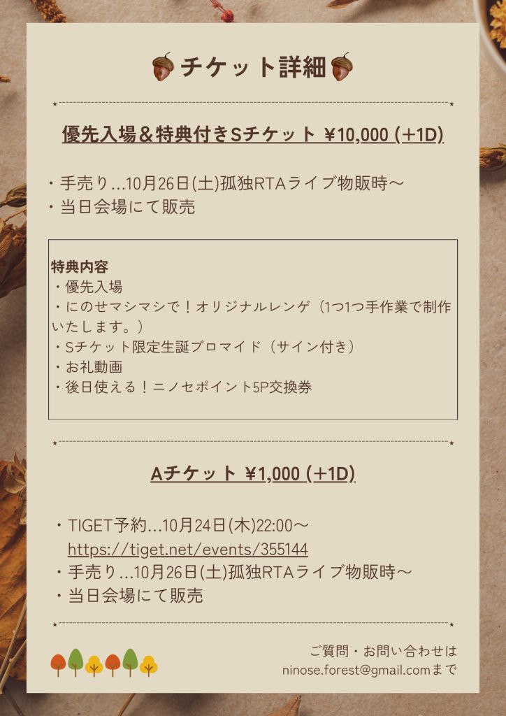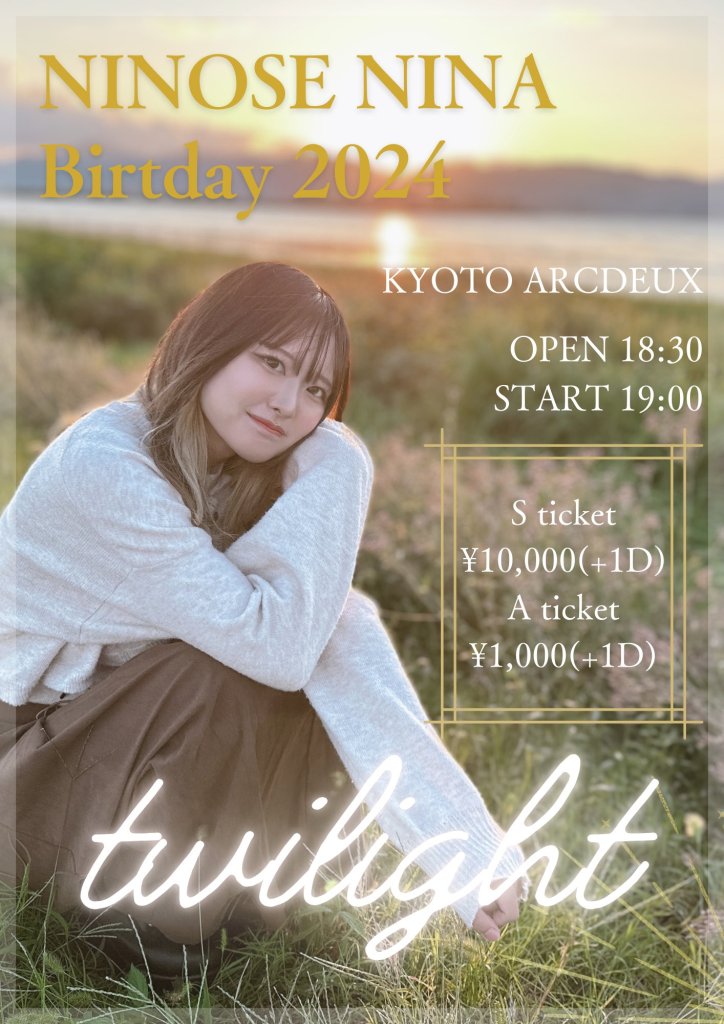 2024/11/16(土)『NINOSE NINA Birthday 2024 -twilight-』@京都ARCDEUX 2024/11/16(土) 『NINOSE NINA Birthday 2024 -twilight-』 会場:京都ARCDEUX OPEN 18:30 / START 19:00 チケット料金:優先入場&特典付きSチケット ¥10,000 (+1D) / Aチケット ¥1,000(+1D) 出演:二ノ瀬仁奈 予約:https://tiget.net/events/355144 2024年11月11日 0