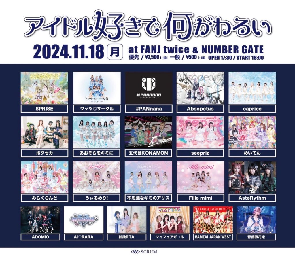 2024/11/18(月) アイドル好きで何がわるい circuit@FANJ twice & ナンバーゲート 2024/11/18(月) アイドル好きで何がわるい circuit 会場:FANJ twice & ナンバーゲート open 17:30 / start 18:00 チケット料金:優先 ¥2,500 / 一般 ¥500 (+1D) 出演:fille mimi/SPRISE/ワッツ◎さーくる/#PANnana/Absopetus/seepriz/あおぞらをキミに/AI♡RARA/マイフェアガ→ル/みらくらんど/ボクセカ/うぃるめり!/不思議なキミのアリス/BANZAI JAPAN WEST/五代目KONAMON/caprice/AsteRythm/孤独RTA チケット予約:https://ticketdive.com/event/idolCircuit2024 2024年11月6日 0
