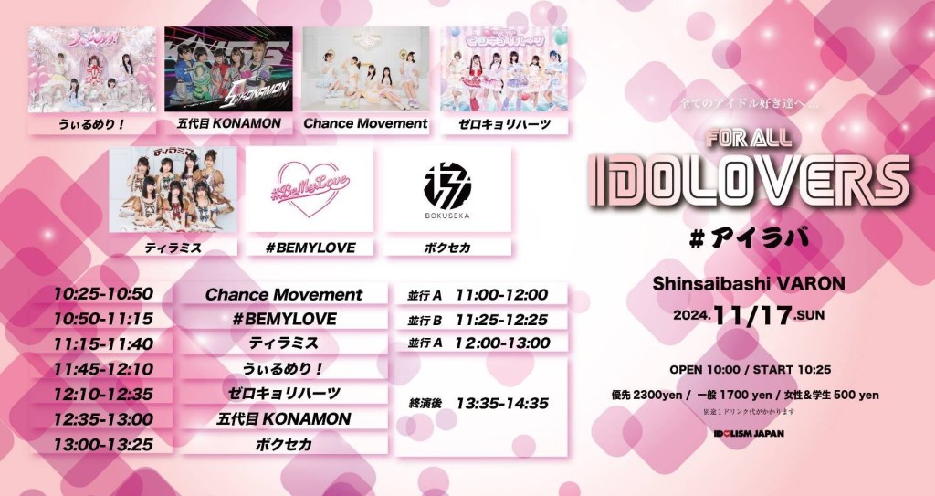2024/11/17(日)「FOR ALL IDOLOVERS #アイラバ」@心斎橋VARON 2024/11/17(日) 「FOR ALL IDOLOVERS #アイラバ」 会場:心斎橋VARON OPEN 10:00 / START 10:25 チケット料金:優先エリア 2300円 / 一般 1700円 / 女性&学生 500円(+1D) 出演:うぃるめり! / 五代目KONAMON / chance Movement / ゼロキョリハーツ / ティラミス / #BEMYLOVE / ボクセカ 予約:https://tiget.net/events/358846 2024年11月12日 0