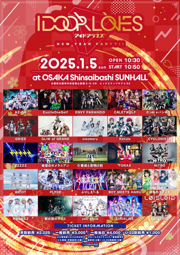 2025/1/5(日)「”IDOORLOVES” -New Year Party-」@心斎橋SUNHALL(大阪・心斎橋) 2025/1/5(日) 「”IDOORLOVES” -New Year Party-」 会場:心斎橋SUNHALL(大阪・心斎橋) OPEN 10:30 / START 10:50 出演:AZ-ON / ExciteOneSelf / ENVY PARANOID / CALETWOLF / ガンジャバンギラス / GRiED / GLIM of GRAND / cleomery / Ketulo / CYCLONISTA / ZZZZZ / 絶望のポメラニアン / 0番線と夜明け前 / TORAX / NiTRO / BR!OT / PLYDE / ぷりしえーる / BOY MEETS HARU / 僕等のスイッチ / MAGMAZ / 都の国のアリス / you-show / .LiNIXLiNE. / LØISLOID チケット料金:早割前売 2,025円 / 一般前売 3,000円 / 一般当日 4,000円 / U-22割前売 1,000円(各D代別) チケット予約:https://t.livepocket.jp/e/0105id 2024年12月19日 0