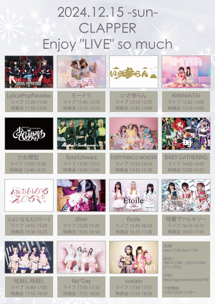 2024/12/14(土)「Enjoy “LIVE” so much」@心斎橋CLAPPER(大阪・東心斎橋) 2024/12/15(日) 「Enjoy “LIVE” so much」 会場:心斎橋CLAPPER(大阪・東心斎橋) OPEN 11:00 / START 11:20 出演:sustain / ByteSchwarz / 少女模型 / BABY GATHERING / dîner / REBEL REBEL / EVERYTHING IS WONDER / Étoile / 残響ヴァルキリー / ふぁいなるえぴろ〜ぐ / No*Day / LylicalPopParadox / KiMiNiAiTAi / いざ参らん / モードラ チケット料金:予約¥2,500- / 当日¥3,000-(D別) チケット予約:https://tiget.net/events/361768 2024年12月14日 0