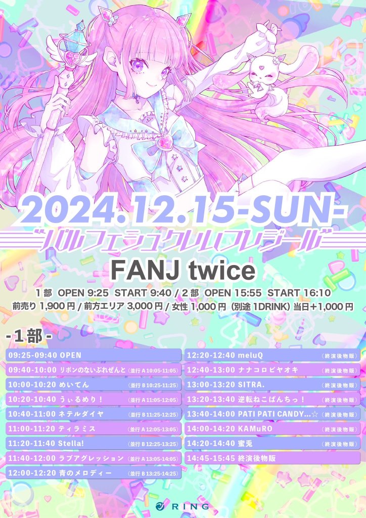 2024/12/14(土)「パルフェシュクレムプレジール」@心斎橋FANJ twice(大阪・心斎橋) 2024/12/15(日) 「パルフェシュクレムプレジール」 会場:心斎橋FANJ twice(大阪・心斎橋) 【1部】OPEN 9:25 / START 9:40 【2部】OPEN 15:55 / START 16:10 出演:【1部】meluQ / SITRA. / 青のメロディー / ラブアグレッション / ナナコロビヤオキ / ティラミス / PATI PATI CANDY…☆ / Stella! / ネテルダイヤ / リボンのないぷれぜんと / めいてん / うぃるめり! / 蜜兎 / 逆転ねこぱんちっ! / KAMuRO 【2部】meluQ / SITRA. / 青のメロディー / PATI PATI CANDY…☆ / Stella! / Qu♡Aly / ネテルダイヤ / リボンのないぷれぜんと / おちゃメンタル☆パーティー / ゆめポケ / すべての瞬間は君だった。 / いつかの夜に僕たちが、 / シェリコフレ / Good knight** / うぃるめり! チケット料金:前売り 1,900円 / 前方エリア 3,000円 / 女性 1,000円(別途 1DRINK) / 当日 +1,000円 チケット予約:【1部】https://tiget.net/events/354265【2部】https://tiget.net/events/354266 2024年12月14日 0