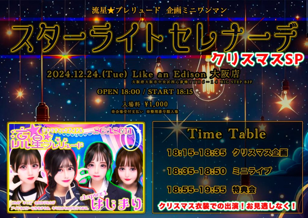 2025/1/16(木)「流星★プレリュード企画ミニワンマン『スターライトセレナーデ』”クリスマスSP”」@Like an Edison 大阪店(大阪・西心斎橋) 2024/12/24(火) 「流星★プレリュード企画ミニワンマン『スターライトセレナーデ』”クリスマスSP”」 会場:Like an Edison 大阪店(大阪・西心斎橋) OPEN 18:00 / START 18:15 出演:流星★プレリュード チケット料金:入場料 ¥1,000 チケット予約:https://tiget.net/events/366875 2024年12月21日 0